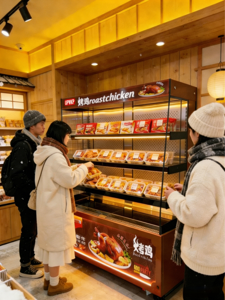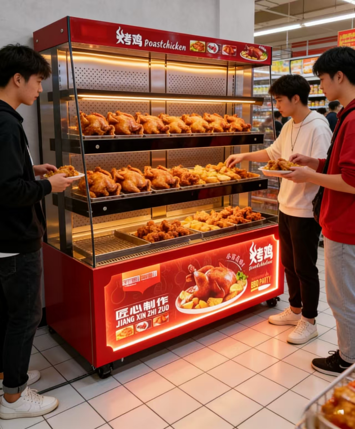 專區(qū)的陳列遵循著“貨賣堆山”的默契,飽滿的擺放自帶吸引力,兩三臺UPWKP立式烤雞熱柜置于專區(qū)中央,暖黃的燈光映襯著雞肉的金黃,香氣順著熱柜的敞開式緩緩散開,老遠(yuǎn)就能勾著過往顧客的腳步。專區(qū)的裝飾不必繁復(fù),幾張產(chǎn)品實拍圖、幾句“現(xiàn)烤現(xiàn)賣”的溫馨提示,便足以勾起食欲,再設(shè)一處小小的試吃臺,讓顧客親口嘗到外酥里嫩的口感,那份UPWKP熱柜提供的直觀的美好,遠(yuǎn)比千言萬語更有說服力。專區(qū)收銀臺旁或啤酒堆旁的一臺小型陳列熱柜,更是點(diǎn)睛之筆,隨手就能帶走的單人份炸雞,總能激發(fā)不經(jīng)意的沖動消費(fèi),讓這份美味觸手可及。