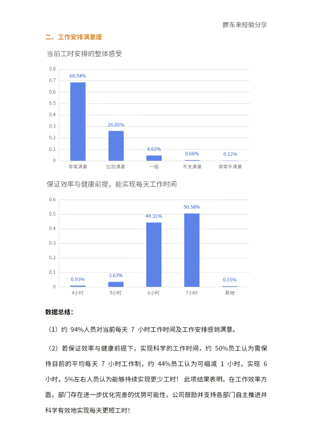 工時(shí)滿意度:對(duì)每日7小時(shí)工作安排,68.54%非常滿意、26.05%比較滿意,合計(jì)滿意度約94.6%;在效率與健康前提下,50.58%的員工傾向維持7小時(shí)工作制,44.31%希望縮減至6小時(shí)。