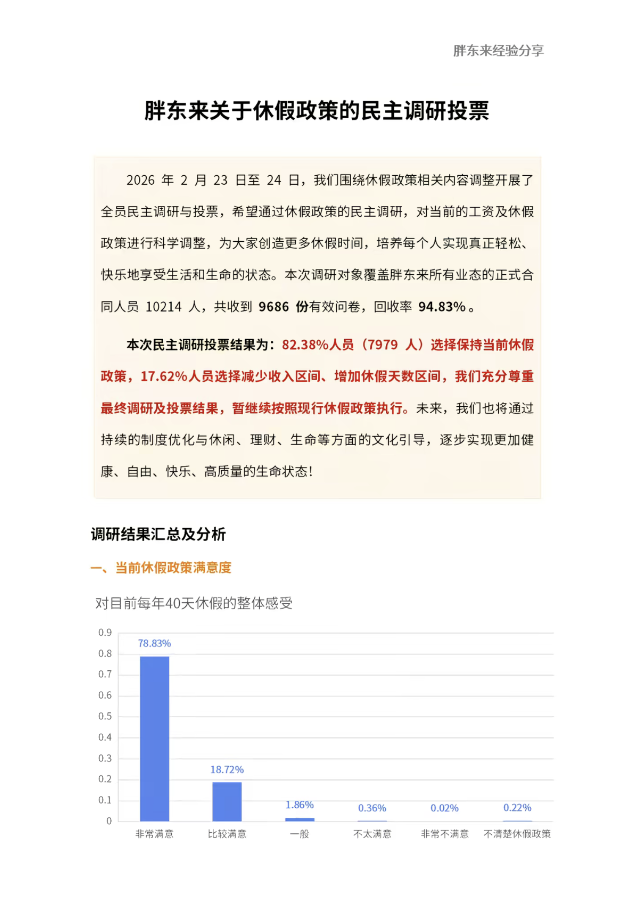 胖東來方面表示,此次民主調(diào)研體現(xiàn)了企業(yè)對(duì)員工意愿的充分尊重,未來將持續(xù)優(yōu)化制度,引導(dǎo)員工平衡休閑與財(cái)富,踐行“以人為本”的經(jīng)營(yíng)理念。