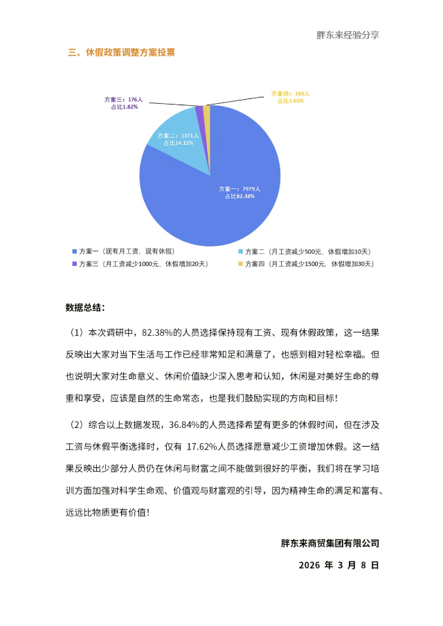 在核心政策調(diào)整投票環(huán)節(jié),公司給出了四種方案:方案一(現(xiàn)有月工資,現(xiàn)有休假)、方案二(月工資減少500元,休假增加10天)、方案三(月工資減少1000元,休假增加20天)、方案四(月工資減少1500元,休假增加30天)。其中,82.38%的員工(7979人)選擇方案一,維持現(xiàn)有月工資與休假政策,僅17.62%的員工選擇二、三、四方案,愿意通過減少工資(最多減1500元)來增加休假天數(shù)(最多增30天)。