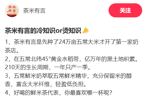 奈雪的米布布系列奶茶,是用五常大米稻花香2號(hào)加鮮奶熬煮制成綿密米布,通過小米粒增強(qiáng)咀嚼感;茶米有言則把五常大米做成鮮米云蓋、用炒米做頂料……
