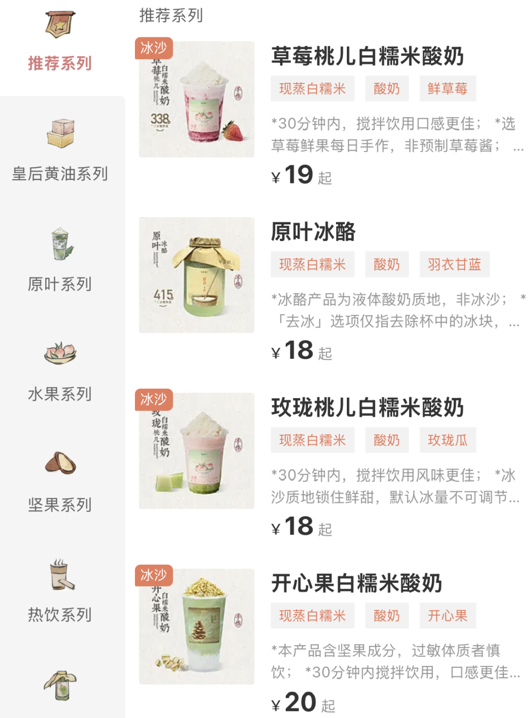 目前,該品牌主要圍繞五常大米開發(fā)飲品,以五常鮮米奶作為基底,推出了鮮果米冰、鮮米輕茶、鮮沏果茶、鮮沏茶等多類產(chǎn)品,門店內(nèi)的各類小料鮮米豆花、鮮米云蓋、鮮作米布、鮮米爆珠等,也均以五常大米為原料。