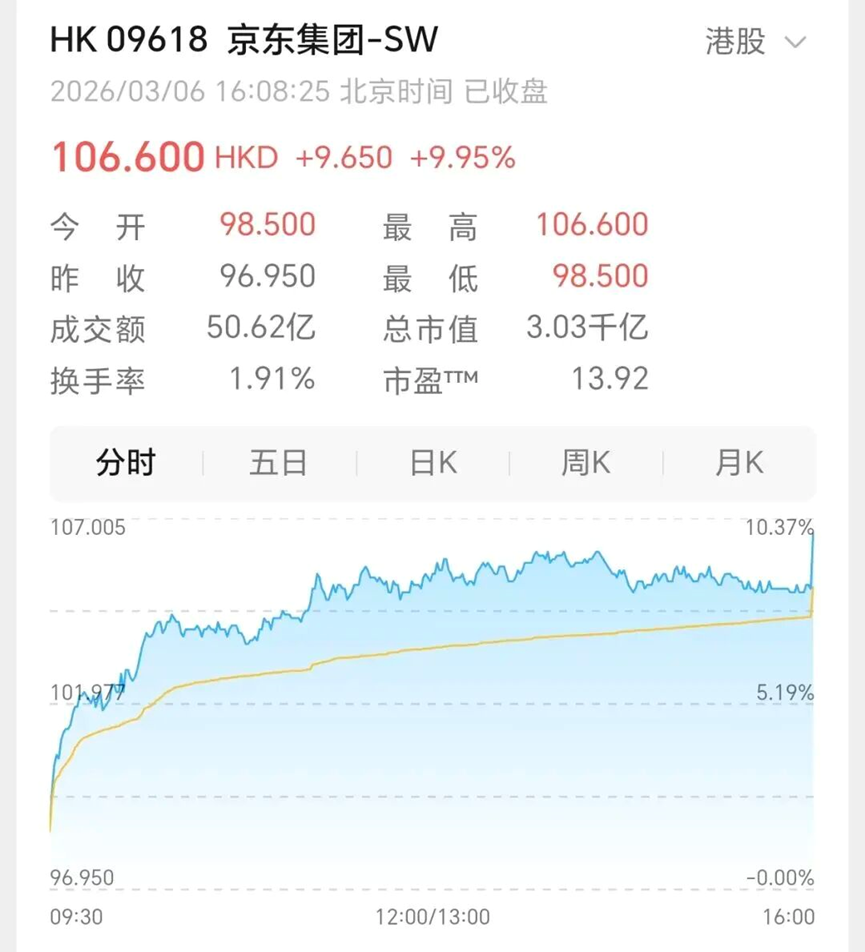 不過,資本市場(chǎng)看重的不是短期得失,而是未來預(yù)期。因此,這份“大起大落”的財(cái)報(bào)一經(jīng)發(fā)出,3月6日港股收盤,京東股價(jià)應(yīng)聲暴漲9.95%,集團(tuán)總市值超3000億港元。