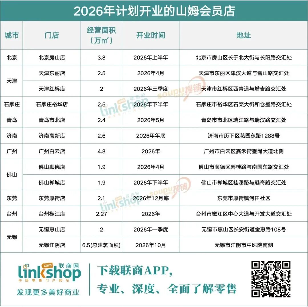 據(jù)聯(lián)商網(wǎng)統(tǒng)計,2026年山姆中國計劃新開13家新店,分布在北京、天津、石家莊、青島、濟南、廣州、佛山、東莞、臺州、無錫10個城市。其中,石家莊、濟南、青島、佛山和臺州5個城市將迎來首家山姆。