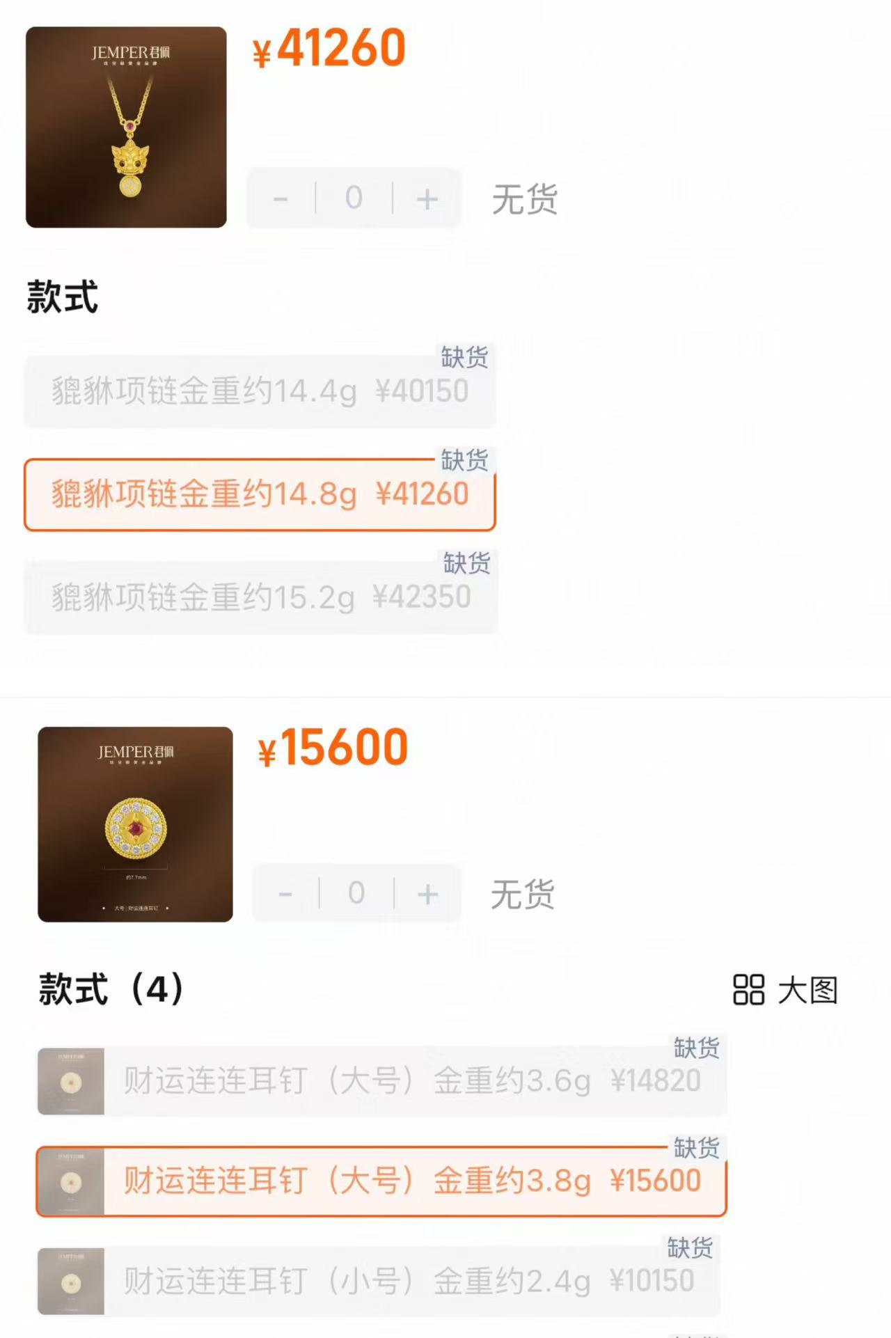 以君佩經(jīng)典款mini貔貅項(xiàng)鏈為例,漲價(jià)前15克售價(jià)約29000元,克價(jià)約1933元;漲價(jià)后14.8克售價(jià)約41250元,克價(jià)飆升至2787元。更夸張的是,一款3.8克的財(cái)運(yùn)連連耳釘售價(jià)達(dá)14932元,克價(jià)約合4105元。