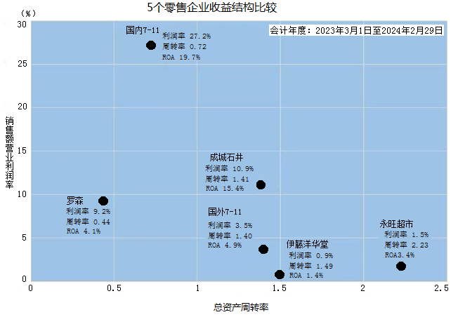 在流通行業(yè)有一句套話:“強大的超市就是制造業(yè)”,意思是超市之強在于食品制造。2023年度,日本高端精品超市成城石井的純利潤率為10.9%,ROA(當期凈利潤÷總資產)為15.4%,周轉率為1.41,作為超市的經(jīng)營質量相當可觀。