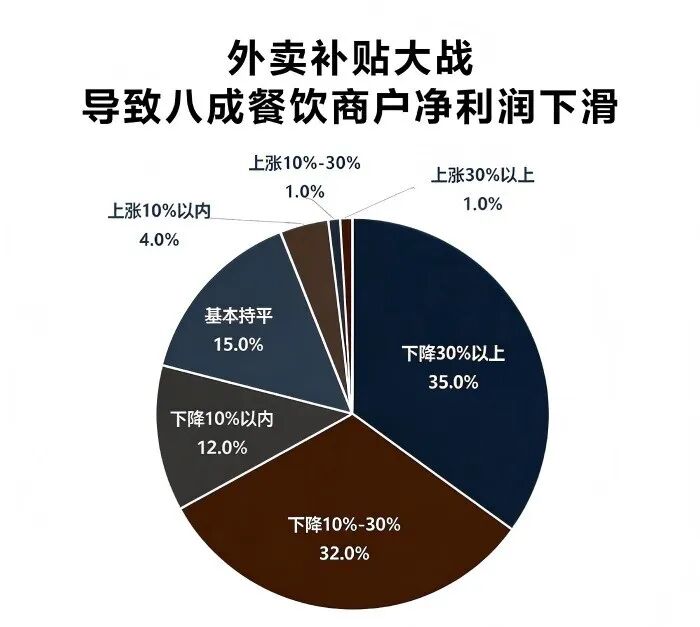 這不是個別餐飲老板的觀感,立信咨詢發(fā)布研究報告《從流量狂歡到利潤下滑:“補貼大戰(zhàn)”中餐飲商戶的真實處境》(以下簡稱“報告”)顯示,持續(xù)一年的外賣補貼大戰(zhàn),正引發(fā)餐飲行業(yè)“通縮”,使餐飲商戶普遍承受營收與利潤的雙重壓力。調(diào)查結(jié)果表明,八成餐飲商戶凈利潤下滑,降幅超過30%的占35%。