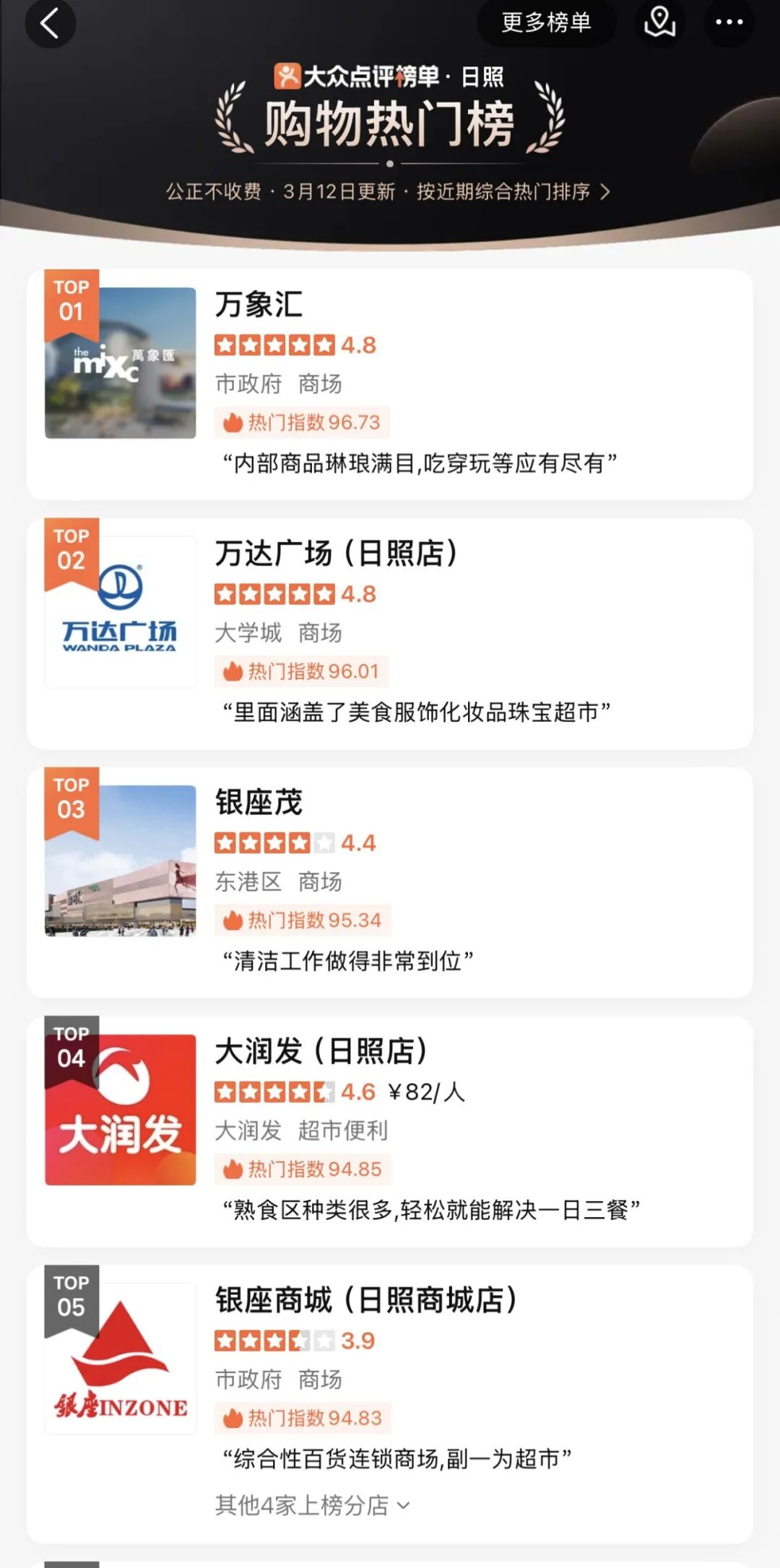 ▲萬象匯與萬達(dá)廣場(chǎng)列“大眾點(diǎn)評(píng)日照購物熱門榜”前二