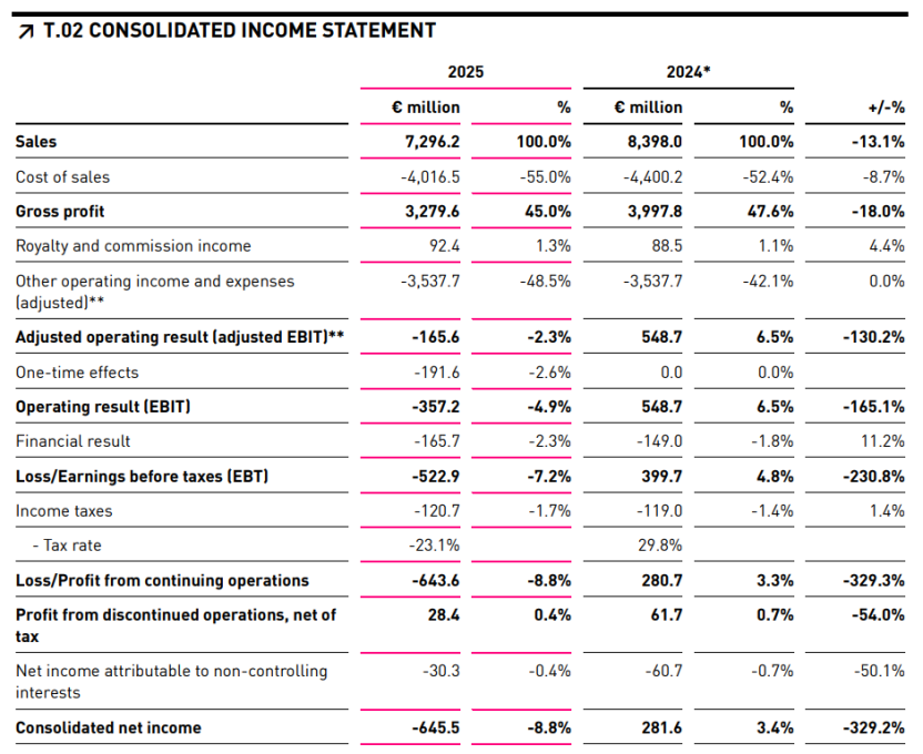 日前,彪馬發(fā)布2025年全年財(cái)報(bào),截至2025年12月31日,其全年銷售額同比下降8.1%至72.96億歐元(約合人民幣577.37億元);持續(xù)經(jīng)營(yíng)業(yè)務(wù)虧損約6.44億歐元(約合人民幣50.96億元),凈虧損約6.46億歐元(約合人民幣51.12億元),與上一年相比轉(zhuǎn)盈為虧;整體毛利率同比下降260個(gè)基點(diǎn)至45%。