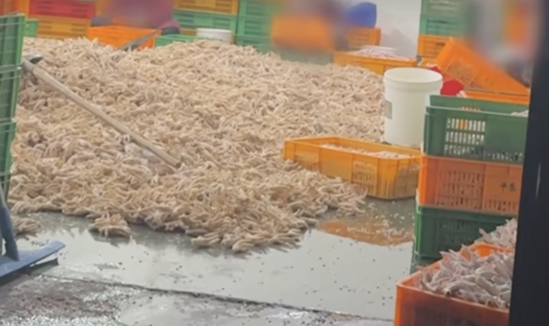 調(diào)查重點(diǎn)指向成都明揚(yáng)食品,其為蜀福香食品加工雞爪,F(xiàn)場觸目驚心:大量雞爪直接裸露堆放在潮濕骯臟的地面上,掃帚、鐵鍬等清潔工具隨意壓放在雞爪之上。即便雞爪被人踩踏,工人也只是隨手撿起,直接放回加工筐中繼續(xù)使用。蜀福香食品工作人員直言“根本不敢吃”,并承認(rèn)使用雙氧水對雞爪進(jìn)行漂白。