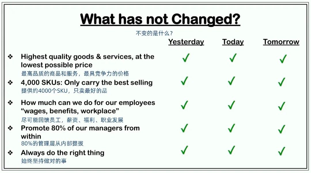 這件事,那些供應(yīng)商會(huì)記上幾十年。他們會(huì)記得,Costco說到做到。我們當(dāng)時(shí)根本不需要那批貨,甚至不得不借錢來支付貨款。但我們的承諾就是承諾,我們要對(duì)得起自己說出口的話。這歸根到底,是我們企業(yè)文化的一次真實(shí)映照。