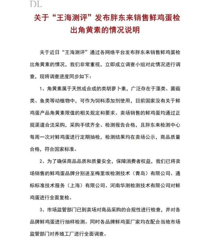 胖東來稱,關(guān)于近日“王海測評(píng)”通過各網(wǎng)絡(luò)平臺(tái)發(fā)布胖東來銷售鮮雞蛋檢出角黃素的情況,非常重視,立即成立調(diào)查小組對(duì)此情況進(jìn)行調(diào)查,現(xiàn)將調(diào)查進(jìn)度同步如下: