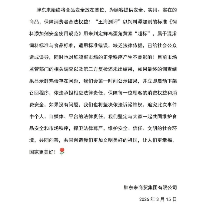 3月15日,針對(duì)在網(wǎng)絡(luò)上發(fā)酵的“雞蛋檢出角黃素”事件,胖東來商貿(mào)集團(tuán)有限公司發(fā)布情況說明。