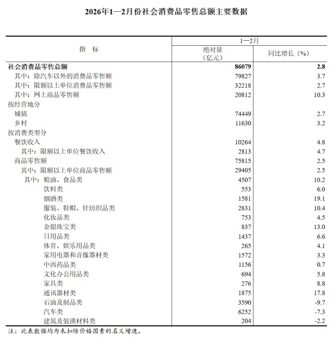 2026年1—2月社會消費品零售總額增長2.8%