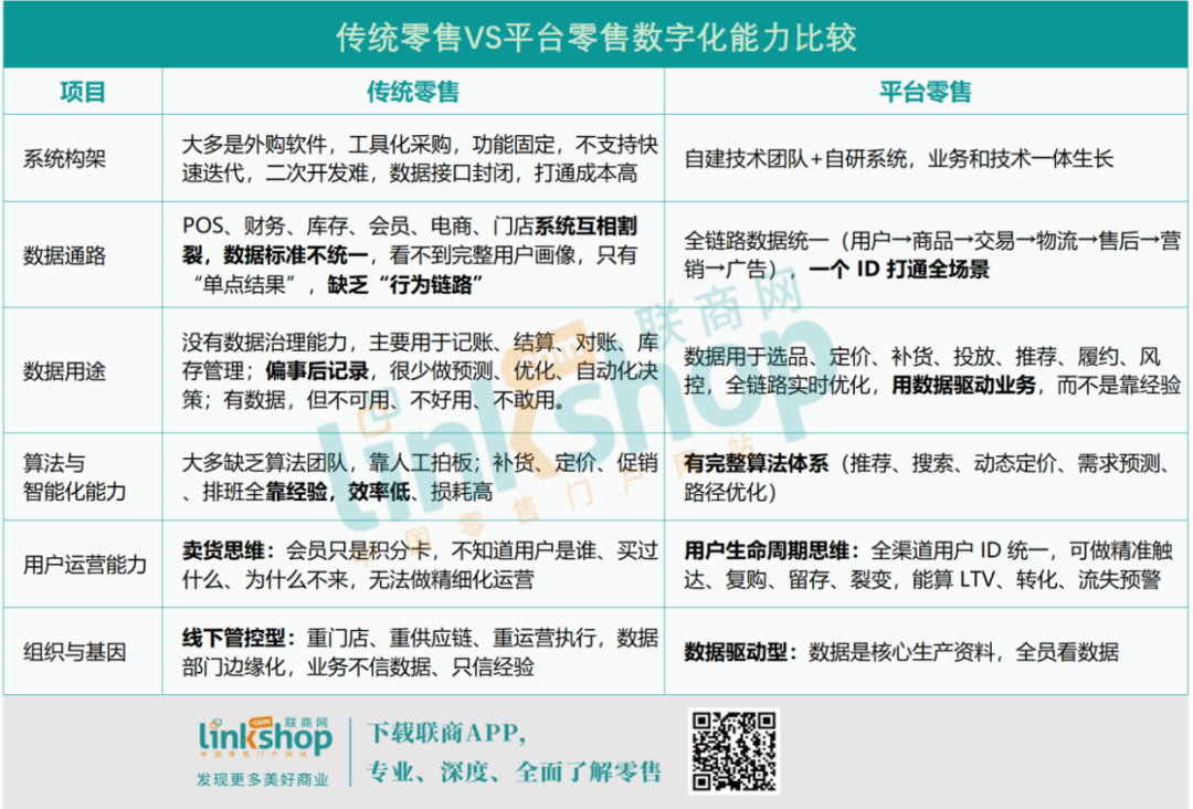 傳統(tǒng)零售的數(shù)字化,多是停留在流程電子化層面;而平臺(tái)型零售的數(shù)字化,是用數(shù)據(jù)重構(gòu)整個(gè)商業(yè)邏輯,從獲客、選品、定價(jià)到履約,全鏈路實(shí)現(xiàn)智能化、效率化運(yùn)營(yíng)。