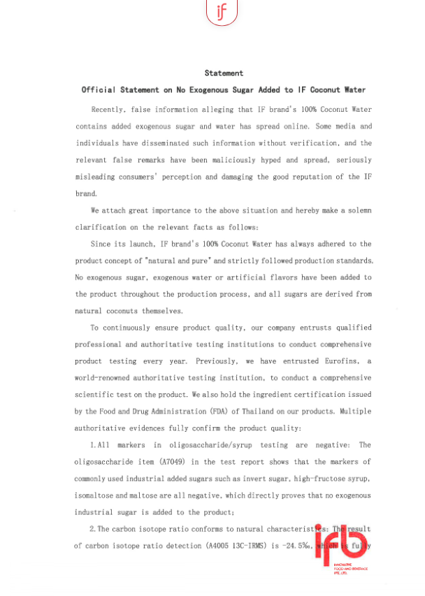 事件發(fā)酵后,IF椰子水在港交所發(fā)布澄清公告,稱媒體相關(guān)指稱虛假且具有誤導(dǎo)性。