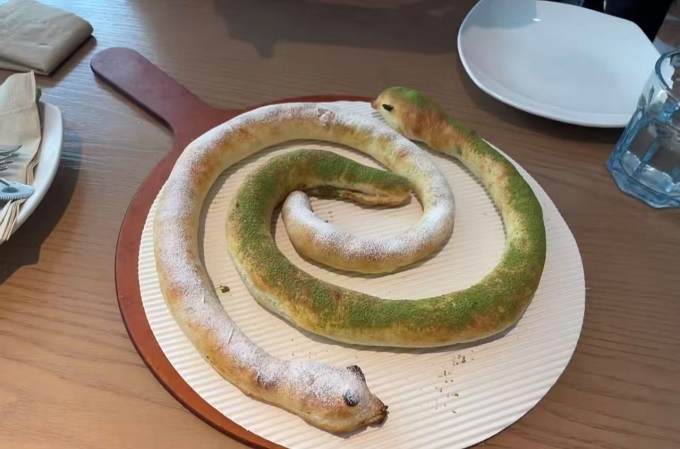 就連一向講究造型的披薩,也在“扮丑”的路上一去不返。必勝客去年愚人節(jié)推出霜雪姐妹雙享披薩,芝士夾心的“白蛇款”和開心果夾心的“輕奢款”都做成蛇形,軟趴趴不成型,反而被網(wǎng)友玩出花樣——捏成胖頭蛇、切成七段,各種二創(chuàng)視頻在網(wǎng)上刷屏。