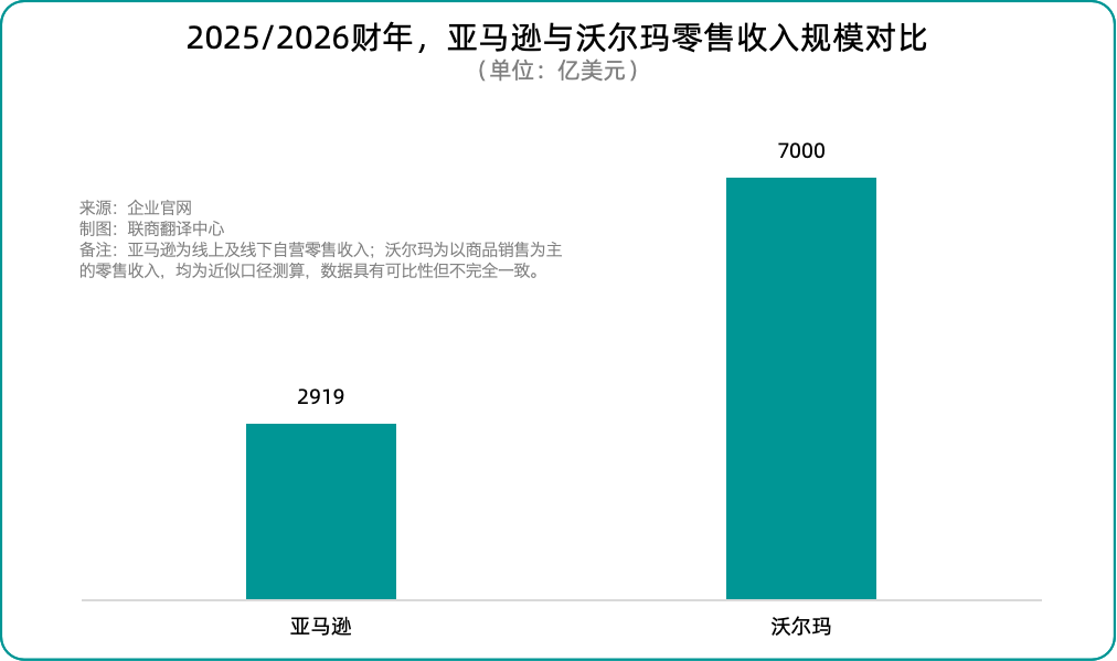 如果從以“賣貨”為核心的零售維度看,亞馬遜線上、線下零售板塊合計營收2919億美元(約2.01萬億元人民幣);而沃爾瑪以商品銷售為主的零售收入規(guī)模接近7000億美元(約4.82萬億元人民幣)。相比之下,沃爾瑪?shù)念I(lǐng)先優(yōu)勢依然十分明顯。