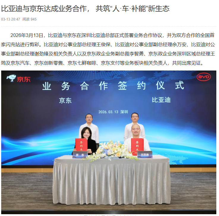 另一張?jiān)谏钲凇?月13日,京東與比亞迪在深圳正式簽署業(yè)務(wù)合作協(xié)議,并為雙方合作的全國首家閃充站剪彩,七鮮咖啡作為核心服務(wù)入駐。