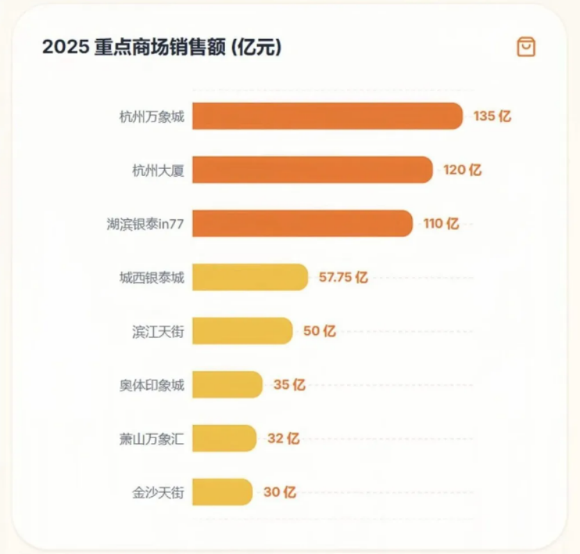 根據(jù)《杭州2025商業(yè)地產(chǎn)年度報(bào)告》,2025年杭州大廈銷(xiāo)售額為120億元;同年,杭州萬(wàn)象城實(shí)現(xiàn)135億元的全年銷(xiāo)售額,在2024年首度超車(chē)后再次取代杭州大廈,成為杭州商業(yè)地產(chǎn)頂流。