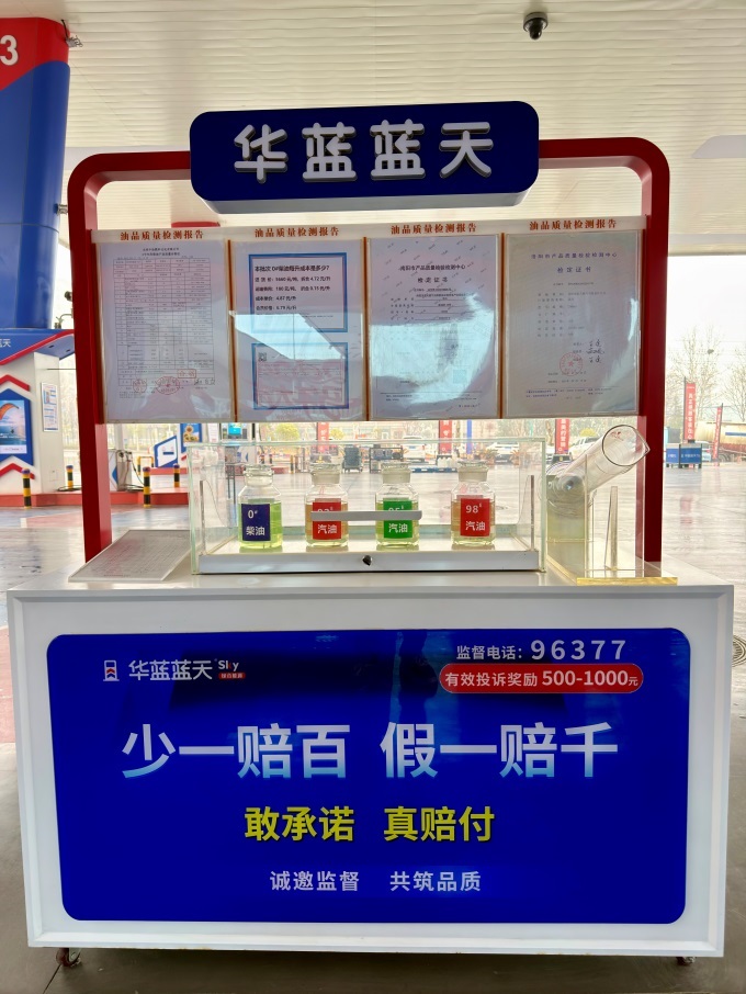 更讓行業(yè)震動的是,華藍(lán)藍(lán)天首創(chuàng)“誠信之窗”——每個(gè)場站設(shè)置油品展示柜,主動向社會公示產(chǎn)品計(jì)量、采購價(jià)格及渠道,公開承諾“少一賠百,假一賠千”。同時(shí)設(shè)置監(jiān)督電話,客戶有效投訴可獲得500-1000元獎(jiǎng)勵(lì)。