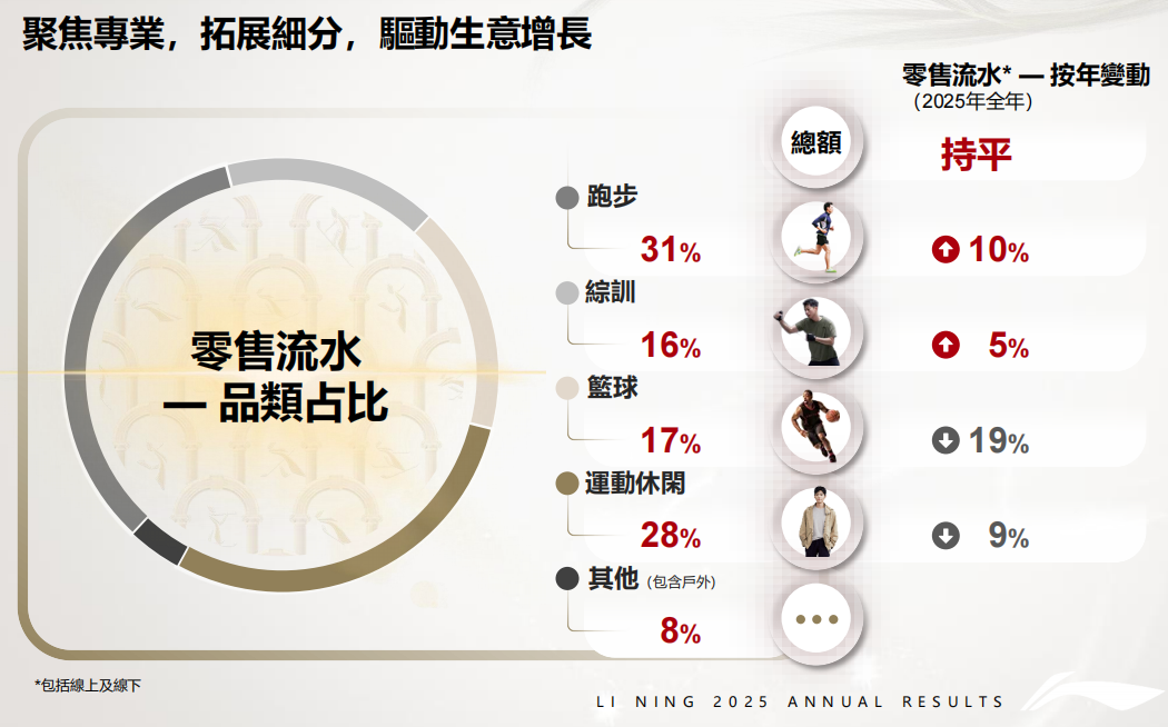 盡管在跑步及羽毛球兩大賽道有不錯(cuò)的表現(xiàn),在籃球、運(yùn)動(dòng)休閑,李寧的流水卻分別下跌了19%和9%。