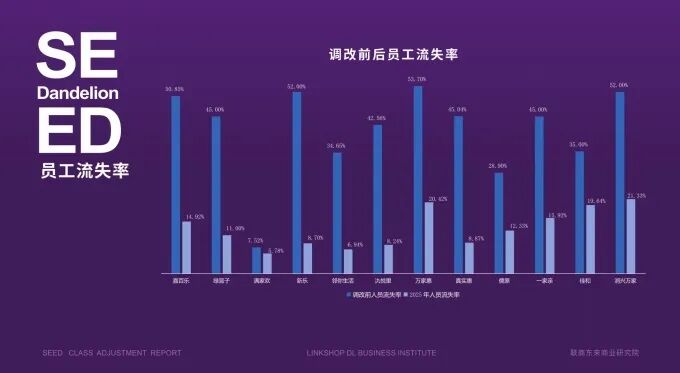 第三,員工流失率大幅下降。比如嘉百樂調(diào)改前員工流失率為50.85%,2025年全年流失率降至14.92%;綠籃子從45%下降到11%;滿家歡的員工流失率一直控制得很好;新樂從52%降到8.7%;鄰你從34.65%下降到6.9%;氿悅里從42.56%降到8.2%;萬家惠從53.70%下降到20.42%;真實(shí)惠降至8.87%;儒原降至12.33%;一家親降至15.92%;佳和降至19.64%;潤興萬家為21.33%。