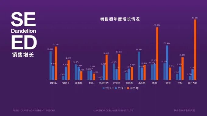 第四,銷售額實(shí)現(xiàn)穩(wěn)步增長。這里給大家展示的是2023到2025年每家企業(yè)的銷售營業(yè)額增長情況,需要強(qiáng)調(diào)的是,很多種子班企業(yè)都進(jìn)行了大規(guī)模關(guān)店,這份銷售額增長,是在關(guān)店的基礎(chǔ)上實(shí)現(xiàn)的,即便門店數(shù)量大幅減少,銷售業(yè)績依然保持增長。我整理數(shù)據(jù)時(shí),也參考了2024和2025年中國連鎖經(jīng)營協(xié)會(huì)發(fā)布的超市行業(yè)可比銷售增幅數(shù)據(jù)。2023-2025,這三年,超市行業(yè)的經(jīng)營是非常艱難的,最高峰時(shí)57%的企業(yè)銷售額出現(xiàn)同比下滑。在這樣的行業(yè)大環(huán)境下,12家種子班企業(yè)依然實(shí)現(xiàn)了銷售額增長。