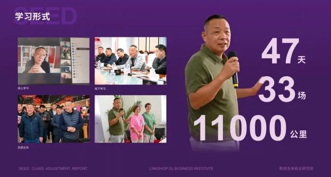 種子班的12家企業(yè)分布在10個(gè)省份。2022年3月28日研究院成立,5月11日,東來哥為種子班帶來了第一次課程,當(dāng)時(shí)屬于疫情頻繁爆發(fā)的時(shí)期,所以前五次課程均以線上形式開展。從2022年5月11日首次授課,到2023年4月30日,東來哥在這一年里用47天時(shí)間走進(jìn)種子班企業(yè),了解財(cái)務(wù)狀況,實(shí)地走訪門店,和員工交流,給中高管開會(huì),先后開展了33場分享,行程約11000公里,十分辛苦。