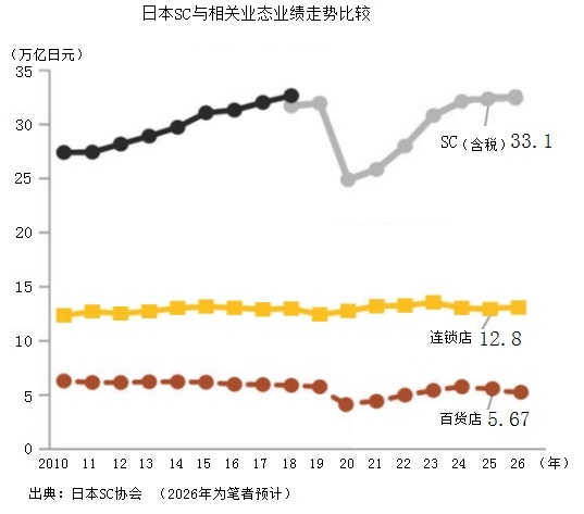 據(jù)日本SC(Shopping Center,購物中心)協(xié)會公示,2025年日本SC業(yè)態(tài)含稅銷售額為33.12萬億日元(約合人民幣1.43萬億元),增長3.5%,連續(xù)五年保持穩(wěn)定增長。不包括主力店鋪,則其他店鋪業(yè)績增長4%,主力店鋪增長1.6%,主力店鋪對整體業(yè)績有負(fù)面拖累。此前最高業(yè)績是2018年含稅業(yè)績?yōu)?2.7萬億日元(約合人民幣1.41萬億元)。