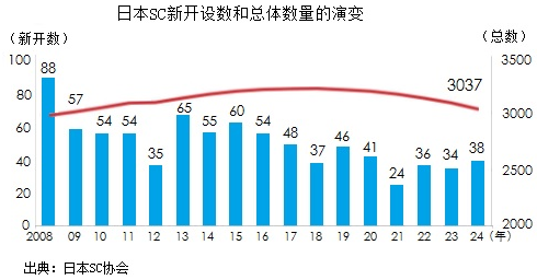 從2024年新開SC區(qū)域分布看,主要集中在東京周邊,東京都有6個,周邊的埼玉縣、神奈川縣有3個。在大都市周邊有18個,中等城市周邊有13個,小型城鎮(zhèn)有7個。其總體規(guī);盍︼@現(xiàn)出兩個趨勢式變化,一是數(shù)量、面積減少;二是向中心區(qū)域集中;三是封閉式樓房風(fēng)格的SC在急劇減少。