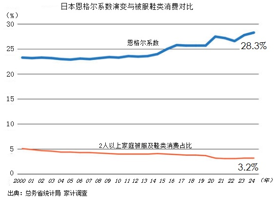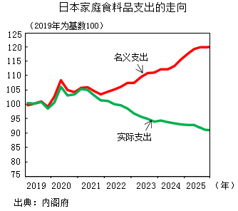 從家庭收入統(tǒng)計數(shù)據(jù)看,兩個人以上家庭2024年收入名義增長4.6%,扣除物價增長因素,實際增長1.4%,2025年延續(xù)這一趨勢。借助政府扶持補貼政策,時隔4年出現(xiàn)真正的增長。從家庭消費支出看,2024年名義上增加2%,實際上下降1.2%。全部家庭樣本整體下降約1.1%。家庭消費更新頻度較高、消費額度較大的被服及鞋類,名義上消費增加3.5%,實際上增加1.1%,2025年消費支出占比大幅度下降。消費持續(xù)增長的項目有:保健醫(yī)療增長2.6%,教育培訓(xùn)增長12.4%,均為剛性消費。休閑娛樂類2024年下降3.6%,在2025年有明顯增長,食料品消費占比呈現(xiàn)緩慢下降態(tài)勢。