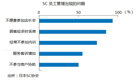 日本SC普遍存在缺員現(xiàn)象,員工充足率和雇傭困難的程度在加重。調(diào)查數(shù)據(jù)顯示,有84%的開發(fā)商面臨租賃商鋪缺員問題。由于員工上崗從業(yè)不充分,租戶員工管理遇到一些新的問題,比如店長不愿意參加集中的店長會等一些公共性活動。