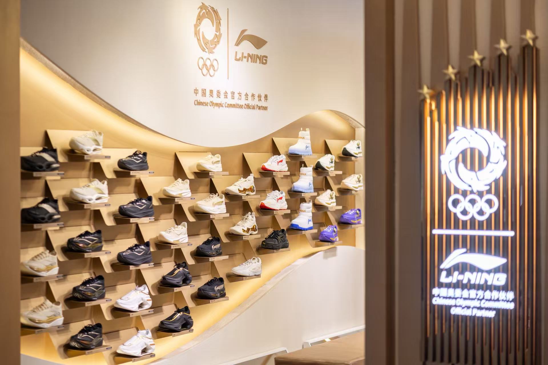 前文提到的戶外店是李寧嘗試的一個(gè)樣本,此外借著李寧重新于中國(guó)奧委會(huì)達(dá)成合作,李寧開啟榮耀金標(biāo)店、龍店等多種快慢閃店型,將奧運(yùn)會(huì)標(biāo)簽于品牌和產(chǎn)品做強(qiáng)綁定,打造全新的消費(fèi)場(chǎng)景。