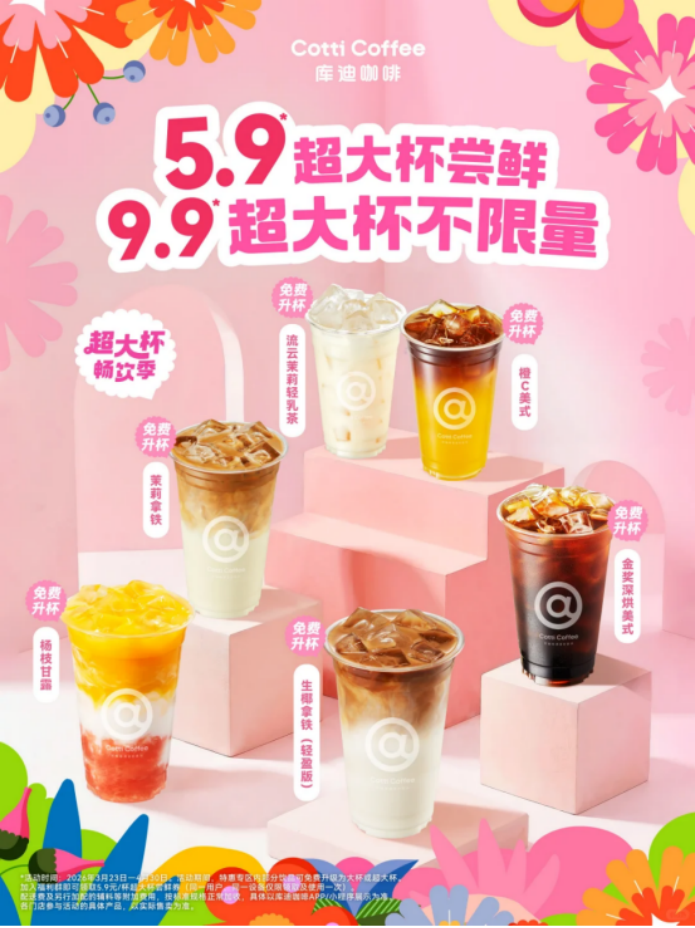而庫迪這邊也堅持了自己的本色,沒有預(yù)熱營銷,沒有限量,把價格福利和時間周期給夠:所有用戶都可以免費解鎖免費升級超大杯,持續(xù)時間是3月23日到4月30日。