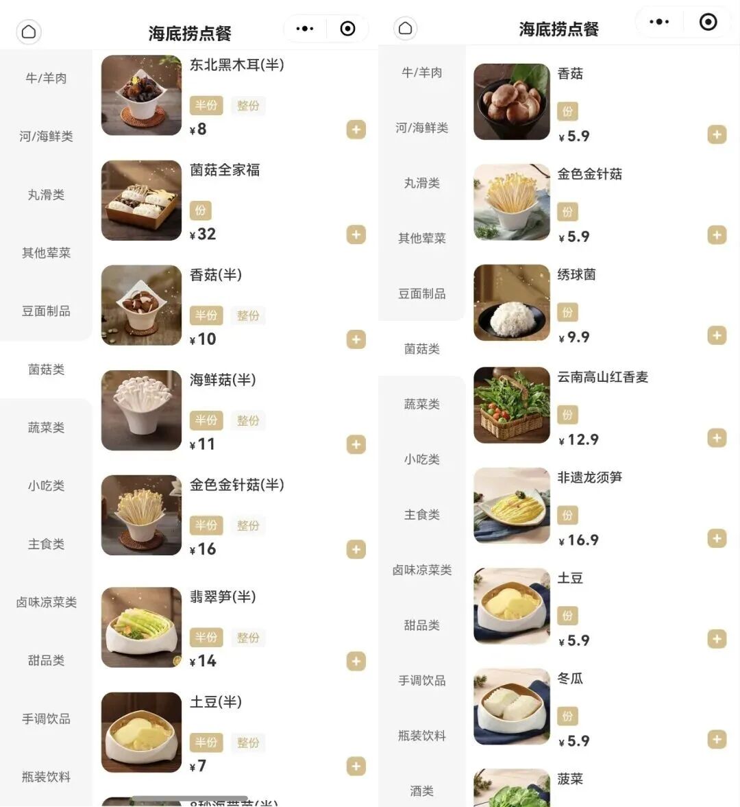 菜品方面,擺盤變得更簡單,但性價(jià)比的“體感”更強(qiáng)烈了。內(nèi)部人員透露,優(yōu)選店的菜品雖然比不上標(biāo)準(zhǔn)店的整份量大,但比半份量要“多出很多”。以金針菇為例,優(yōu)選店一份只要5.9元,而標(biāo)準(zhǔn)店的半份就要16元;土豆一份5.9元,標(biāo)準(zhǔn)店半份7元。