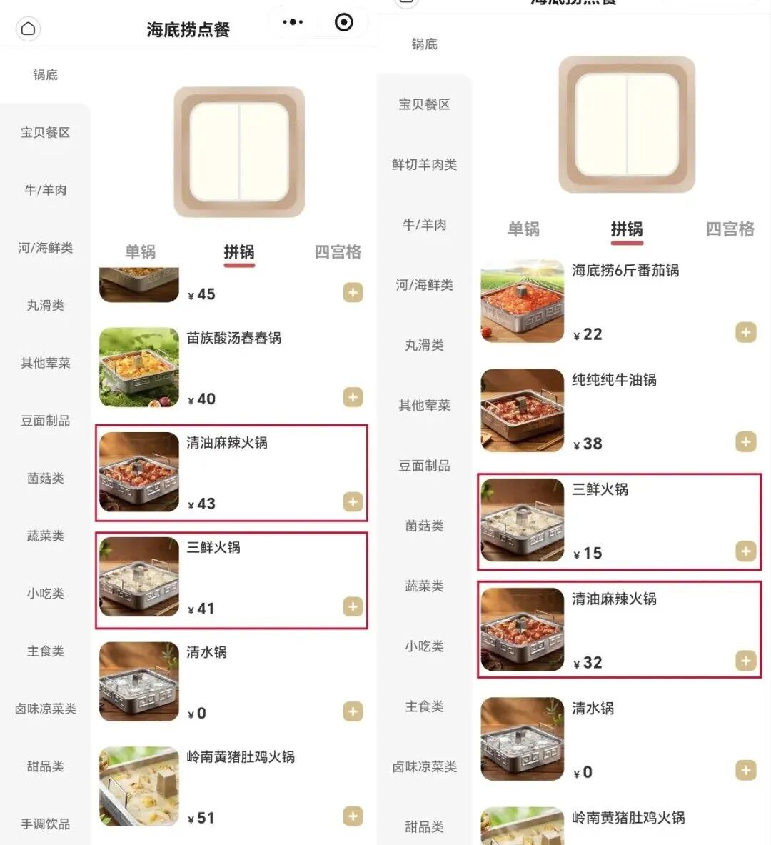 在鍋底上,優(yōu)選店沒有盲目上架標(biāo)準(zhǔn)店的各類特色鍋底——比如苗族酸湯舂舂鍋這類偏嘗鮮型的產(chǎn)品被拿掉了,只保留了最經(jīng)典的招牌鍋底。但價(jià)格上,優(yōu)惠力度肉眼可見:以清油麻辣鍋底為例,對比同省的撫順標(biāo)準(zhǔn)店,優(yōu)選店便宜了9元,僅售32元;三鮮鍋底更是直接砍半,只要15元。