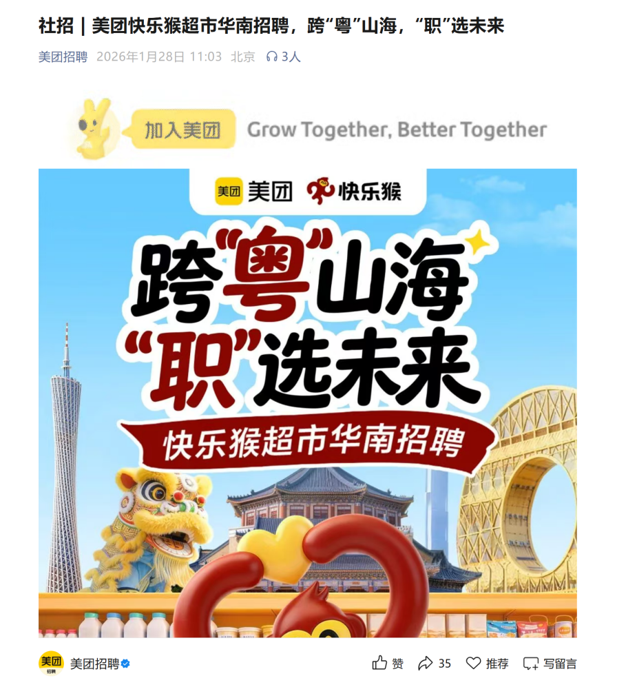 值得注意的是,快樂猴也在加速布局華南市場。據(jù)美團招聘官方公眾號顯示,美團快樂猴超市于1月28日開啟華南市場招聘,覆蓋門店拓展、門店運營、業(yè)務(wù)開發(fā)、商品采購、供應(yīng)鏈五大板塊,具體崗位包括選址拓展經(jīng)理、店長、水果采購專家、3R采購專家等。