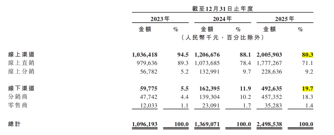 翻開招股書,2025年?duì)I收近25億、毛利率常年穩(wěn)定在70%左右,表面看數(shù)據(jù)亮眼,但背后也有隱憂浮現(xiàn):高度依賴廣告營銷與第三方電商平臺(tái),2025年銷售及分銷開支占比超61%,線上渠道收入占比高達(dá)80.3%。