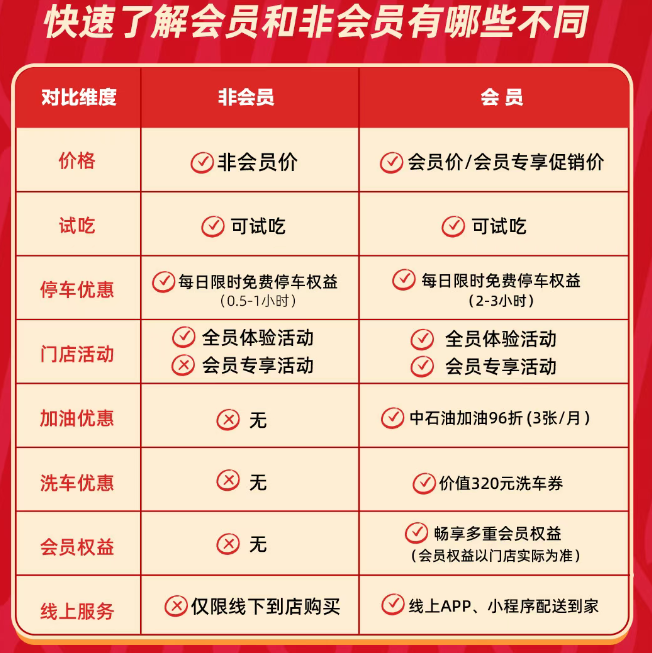 所以,揚(yáng)州店開放非會員,首先是“止血”。降低進(jìn)店門檻,把路過的、好奇的、偶爾想囤貨的客流拉進(jìn)來,先把場子熱起來,穩(wěn)住基本盤。但更關(guān)鍵的是,它不是“無差別開放”,而是“雙軌運(yùn)營”:會員依舊享受專屬低價等核心權(quán)益,非會員只是獲得“進(jìn)店權(quán)”和“購買權(quán)”,但要為“不付費(fèi)”買單——商品更貴、服務(wù)更少。
