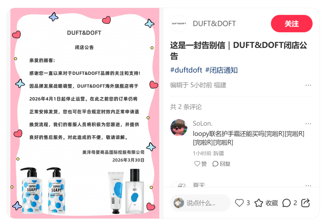 日前(3月30日),聚美麗從小紅書獲悉,韓國輕奢香氛護(hù)理品牌DUFT&DOFT發(fā)布閉店公告,以“品牌發(fā)展戰(zhàn)略調(diào)整”為由,宣布其海外旗艦店將于2026年4月1日起停止運(yùn)營。