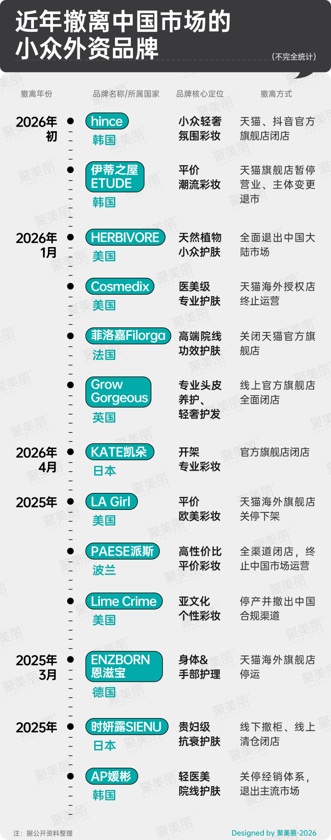 據(jù)聚美麗不完全統(tǒng)計(jì),自2025年以來,已有至少13個(gè)小眾外資品牌,陸續(xù)以閉店、撤柜、終止運(yùn)營等方式退出中國市場。其中,僅2026年開年至今,就有hince、伊蒂之屋、菲洛嘉等超7個(gè)品牌官宣離場,涵蓋彩妝、護(hù)膚、個(gè)護(hù)、香氛等多個(gè)細(xì)分賽道。