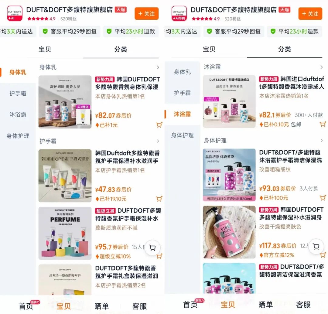 DUFT&DOFT進(jìn)入中國市場時(shí),主打的是“香氛護(hù)手霜”“香氛身體護(hù)理”等垂直品類。彼時(shí),中國消費(fèi)者對香氛個(gè)護(hù)的認(rèn)知尚在培育期,韓國銷冠的光環(huán)確實(shí)能帶來流量。