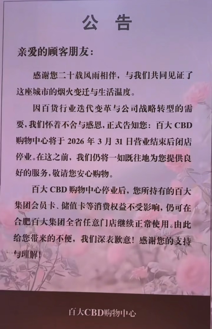 百大CBD在一樓門口張貼的《公告》顯示:因百貨行業(yè)迭代變革與公司戰(zhàn)略轉(zhuǎn)型的需求,我們懷著不舍與感恩,正式告知您:“百大CBD購物中心將于2026年3月31日營業(yè)結(jié)束后閉店停業(yè)!