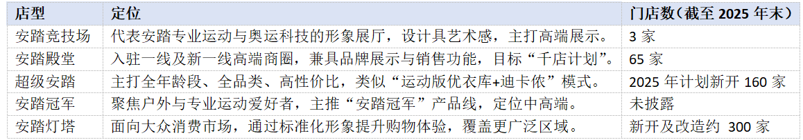 2025年,安踏主品牌也在渠道上進行了改革,根據(jù)不同消費人群布局了不同店型。其中有類似大賣場、覆蓋全品類的“超級安踏”;聚焦專業(yè)運動與高端體驗的“?安踏競技場”;定位高端商圈的“安踏殿堂”;面向大眾消費市場的“安踏燈塔”。