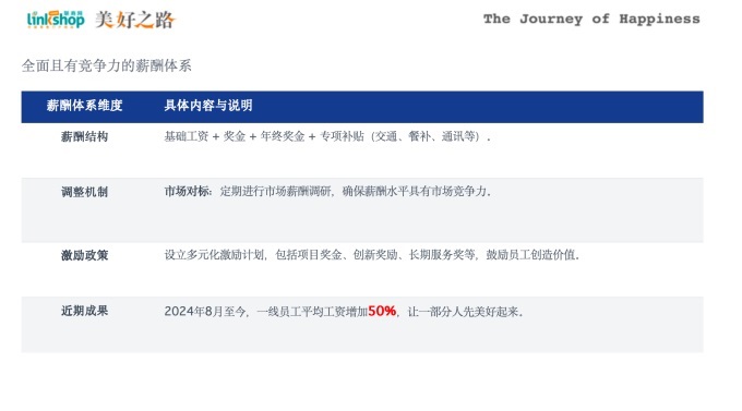 在薪酬體系上,我們打造了全面且有競爭力的體系,結(jié)構(gòu)上包含基礎工資、獎金、年終獎金及交通、餐補、通訊等專項補貼;調(diào)整機制上,每年定期開展市場薪酬調(diào)研,確保我們的薪酬水平確保薪資在達州、四川區(qū)域具備競爭力,讓員工能過上幸福生活;激勵政策上,設立項目獎金、創(chuàng)新獎勵、長期服務獎等多元化激勵計劃,鼓勵員工創(chuàng)造價值。從2024年8月至今,一線員工平均工資已增加50%,讓一部分人先美好起來。