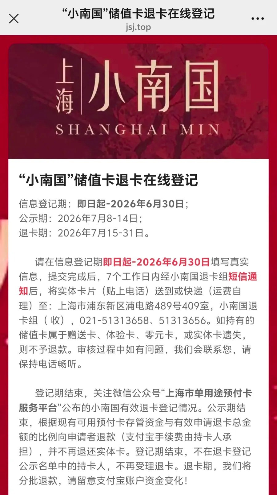 據(jù)公告,持有“小南國”、 “慧公館”、 “南小館”品牌儲值卡并有余額的持卡人,在信息登記即日起至2026年6月30日,掃碼登記。登記期結(jié)束后,單卡協(xié)會在微信公眾號“上海市單用途預(yù)付卡服務(wù)平臺”公示有效退卡登記情況,具體時間為7月8日至14日。公示期結(jié)束后,根據(jù)現(xiàn)有可用預(yù)付卡存管資金與有效申請退卡總金額的比例向申請者退款。