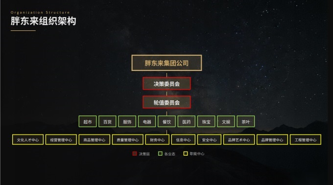接下來(lái)給大家看一下我們的組織架構(gòu)圖,包括九大業(yè)態(tài),十大職能中心,可以看到是非常簡(jiǎn)單、扁平化的。下面給大家分享我們組織設(shè)計(jì)的核心、也就是我們的決策委員會(huì)與輪值委員會(huì)。