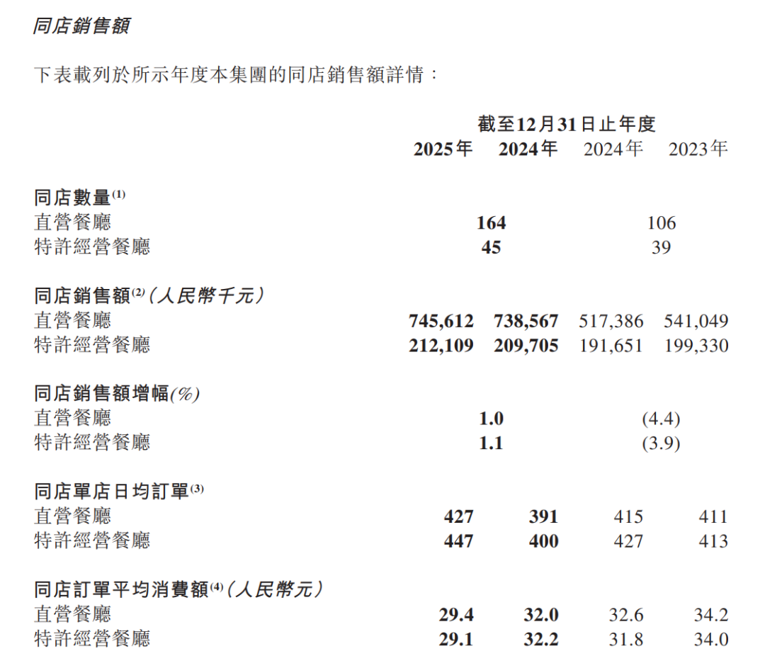 2025年,遇見小面同店銷售實(shí)現(xiàn)突破:直營同店銷售額增長1.0%,特許增長1.1%,徹底扭轉(zhuǎn)2023年雙雙下滑的頹勢;直營同店日均訂單量從391單增至427單,特許經(jīng)營店從400單增至447單。