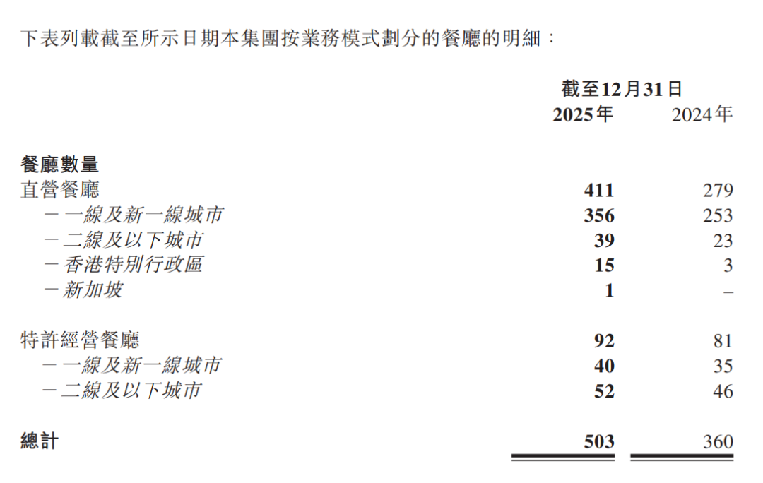 2025其年全年新開門店156家,關(guān)閉13家,凈增143家,門店總數(shù)從2024年底的360家增至503家,增幅達(dá)39.7%。